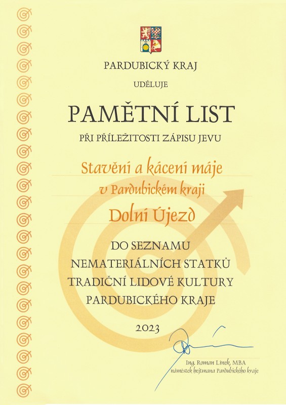 Rada Pardubického kraje schválila zápis jevu Stavění a kácení májí v Pardubickém kraji na Seznam nemateriálních statků tradiční lidové kultury Pardubického kraje. Obyčej stavění a kácení májí je zastoupen ve všech čtyřech okresech, jeho podoba se vyvíjí, ale udržuje si v základních rysech svůj základní charakter.  Předávání se děje přirozeně mezi generacemi. Nositeli jsou jak jednotlivci, tak spolky i samotné obce či města. Existence statku je pro daná společenství důležitým stmelujícím a identifikačním prvkem. V současnosti převládají jeho sociální a společenské funkce.  Jedním z nositelů tohoto obyčeje je nyní i naše obec. Velké poděkování a gratulace patří každému, kdo se podílí na přípravě a organizaci této akce.